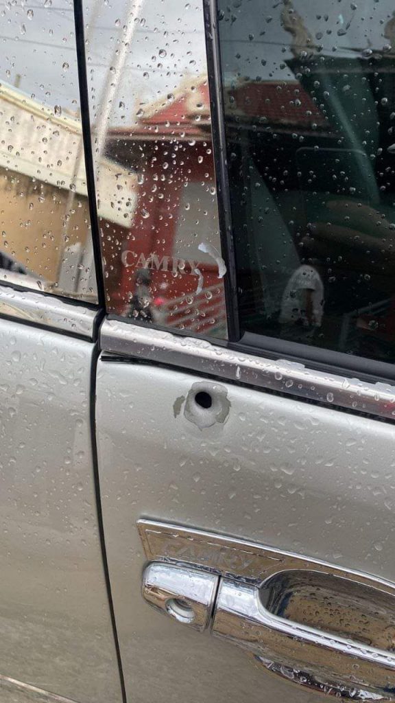 -រថយន្តម៉ាកហាយឡែនឌ័រពណ៌ស ឆ្នាំ២០០១ ពាក់ផ្លាកលេខភ្នំពេញ 2AD-4931ត្រូវចំស្តុបឆ្វេងខាងក្រោយ ០១គ្រាប់និងចំថ្ពល់មុខខាងឆ្វេង០១គ្រាប់។