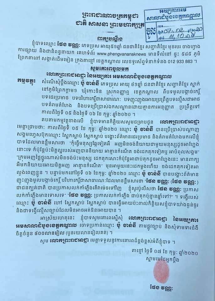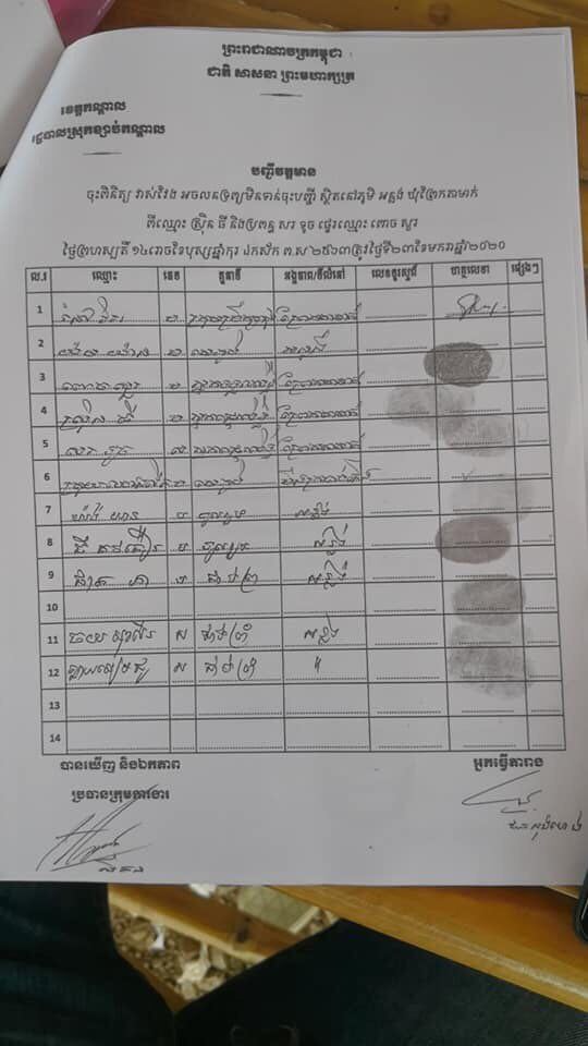 ២-ខ្ញុំបាទបានទិញដីពីឈ្មោះ ប៉ិច លាងសេង និងឈ្មោះ ឡោ ស្រីនាង មានព្រំជាប់គ្នាមានទំហំ (2190) ម៉ែត្រក្រឡា ដោយទីតាំងដីនេះជាប់ និងខ្ទមអ្នកតាស្ងួនជាប់នៅមាត់ត្រពាំងភូមិបឹងក្រចាប់ជើងដីនេះជាអំណោយរបស់រដ្ឋតាំងពីឆ្នាំ1987មកម្លេះ។ ក្រោយពីបានធ្វើលិខិតនិងកិច្ចសន្យាទិញលក់ផ្ទេសិទ្ធិមកខ្ញុំបាទស្រាប់តែលោក គ្រុយ ឈាងលីន ដែលជាមេភូមិបឹងក្រចាប់ជើង លោកបានបបួលខ្ញុំដូរដីដែលខ្ញុំបានទិញពី ប៉ិច លាងសេង និងដី ឡោ ស្រីនាង ជាមួយដីរួមភូមិបឹងក្រចាប់ជើងដែលមានព្រំជាប់ដីខ្ញុំបាទ ដែលទិញពីលោក ស្រុិន ធី គឺដូរទំហំប៉ុនគ្នា (2190) ម៉ែត្រក្រឡា និងទំហំ (2190) ម៉ែត្រក្រឡា ដោយលោក គ្រុយ ឈាងលីន មេភូមិបឹងក្រចាប់ជើងគាត់បានប្រជុំប្រជាជនក្នុងភូមិបឹងក្រចាប់ជើងមួយចំនួននិងក្រុមការងារអភិវឌ្ឍន៍ភូមិមុនពេលដោះដូរ (មានស្នាមមេដៃ) ការដោះដូរនេះ គឺមានផលចំណេញទាំងអស់គ្នា ដែលខ្ញុំបាទបានដីជាប់ព្រំគ្នាជាផ្ទៃដីតែមួយ ដែលខ្ញុំបានទិញពីឈ្មោះ ស្រ៉ិន ធី។