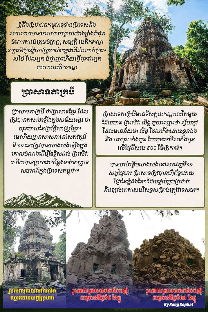 ខ្ញុំនឹងប្រជាជនកម្ពុជាទូទាំងប្រទេសនិង សកលោកមានការសោកស្ដាយយ៉ាងខ្លាំងបំផុត ចំពោះការបំភ្លេចបំផ្លាញ សម្បត្តិ បេតិកភណ្ឌ វប្បធម៌ប្រវត្តិសាស្ត្ររបស់កម្ពុជាពីសំណាក់ប្រទេសថៃ ដែលអ្នក បំផ្លាញហើយធ្វើពុតជាអ្នក ការពារបេតិកភណ្ឌ