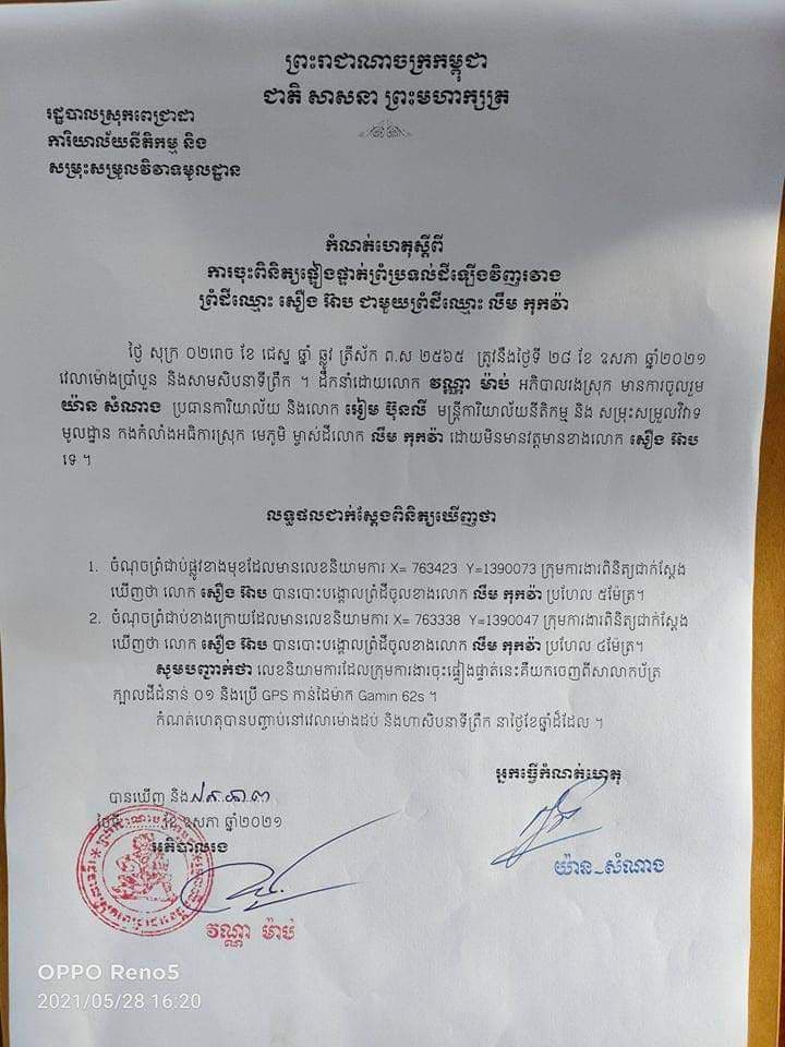 ប៉ុន្តែមកដល់ថ្ងៃទី ២៧ ខែឧសភា ឆ្នាំ២០២១នេះគណ:បញ្ជាការឯកភាពស្រុកដឹកនាំដោយលោក វណ្ណា ម៉ាប់ និងមន្រ្តីជំនាញ លោកយ៉ាន សំណាង លោក អៀម ប៊ុនលី ដើម្បីធ្វើការផ្ទៀងផ្ទាត់នូវទំហំដីតាមលេខក្បាលដី ២៦០។