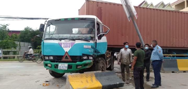 រថយន្តកុងតីន័រមួយគ្រឿងបើកបុកបង្គោលភ្លើងនឹងរបាំងថ្មពុះចែកទ្រូងផ្លូវបាក់អស់់មួយកង់នឹងពីកង់ទៀតរបើកចេញពីជួររងការខូចខាតយ៉ាងដំណំ…